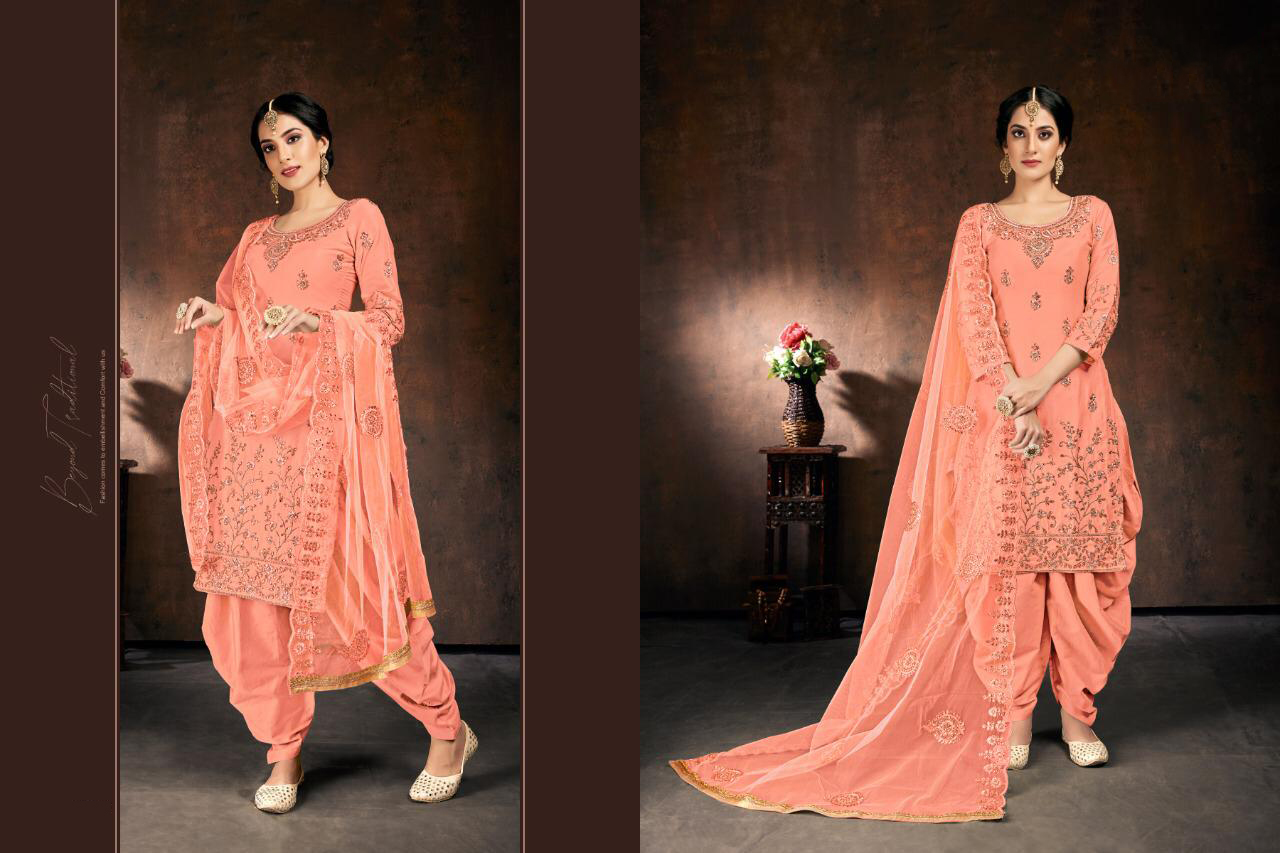 This beautiful elegant readymade patiala salwar kameez top comes in pure jam silk with embroidery and stone work and bottom comes in premium jam silk. Dupatta comes in premium net with embroidery and stone work. Bust: 46" Waist: 44"-45"