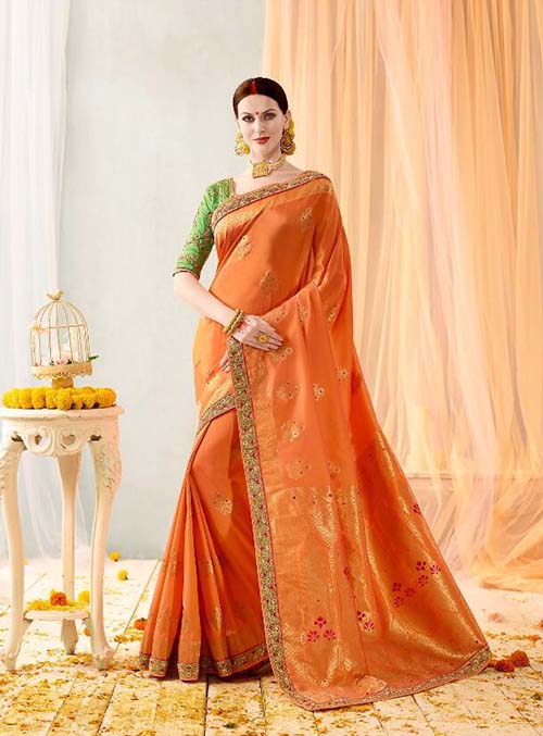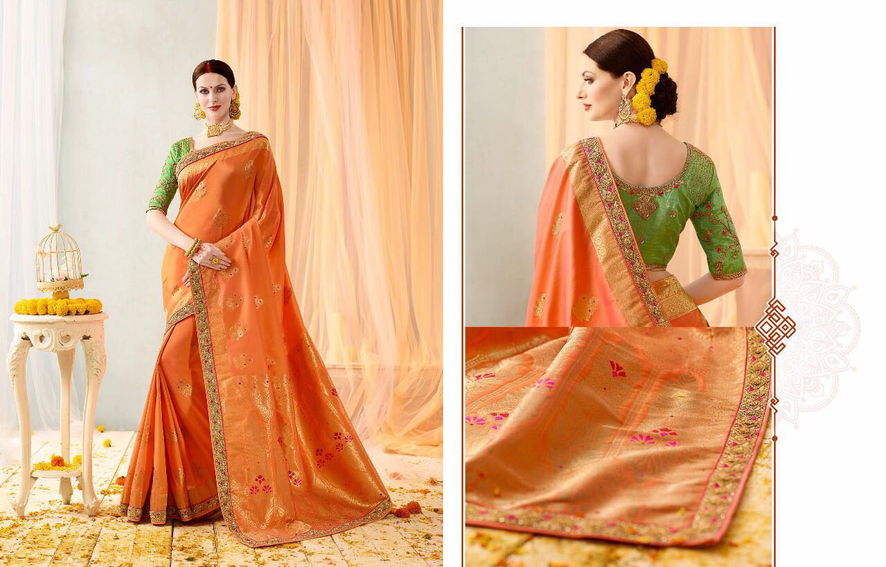 This premium pure banarasi silk saree enhanced with heavy jacquard zari work. This beautiful saree comes with two blouses in unstitched form, one designer silk blouse comes with embroidered golden zari work and second blouse comes in plain premium silk.