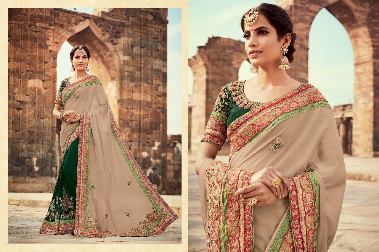 Beautiful Georgette Indian saree / sari enhanced with elegant embroidery, comes with embroidered art silk blouse in unstitched form.
