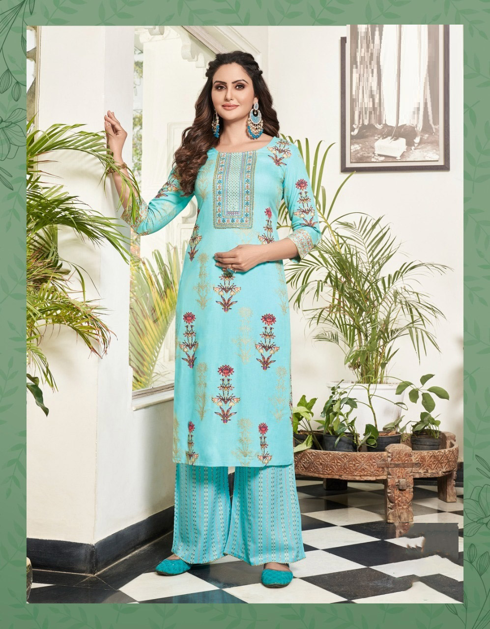 This beautiful palazzo kurti top comes in rayon and is enhanced with elegant work. Palazzo bottom comes in premium rayon.