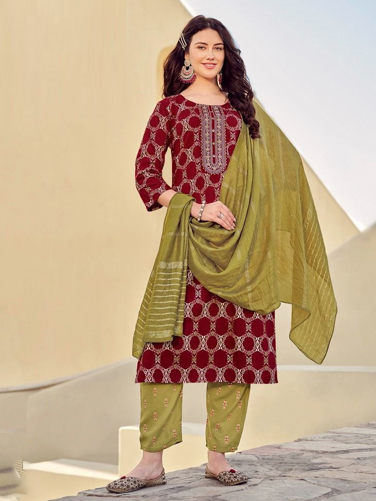This beautiful pant kurti suit top comes in rayon and is enhanced with elegant work. The designer pant bottom comes in premium rayon. Dupatta comes in jacquard.