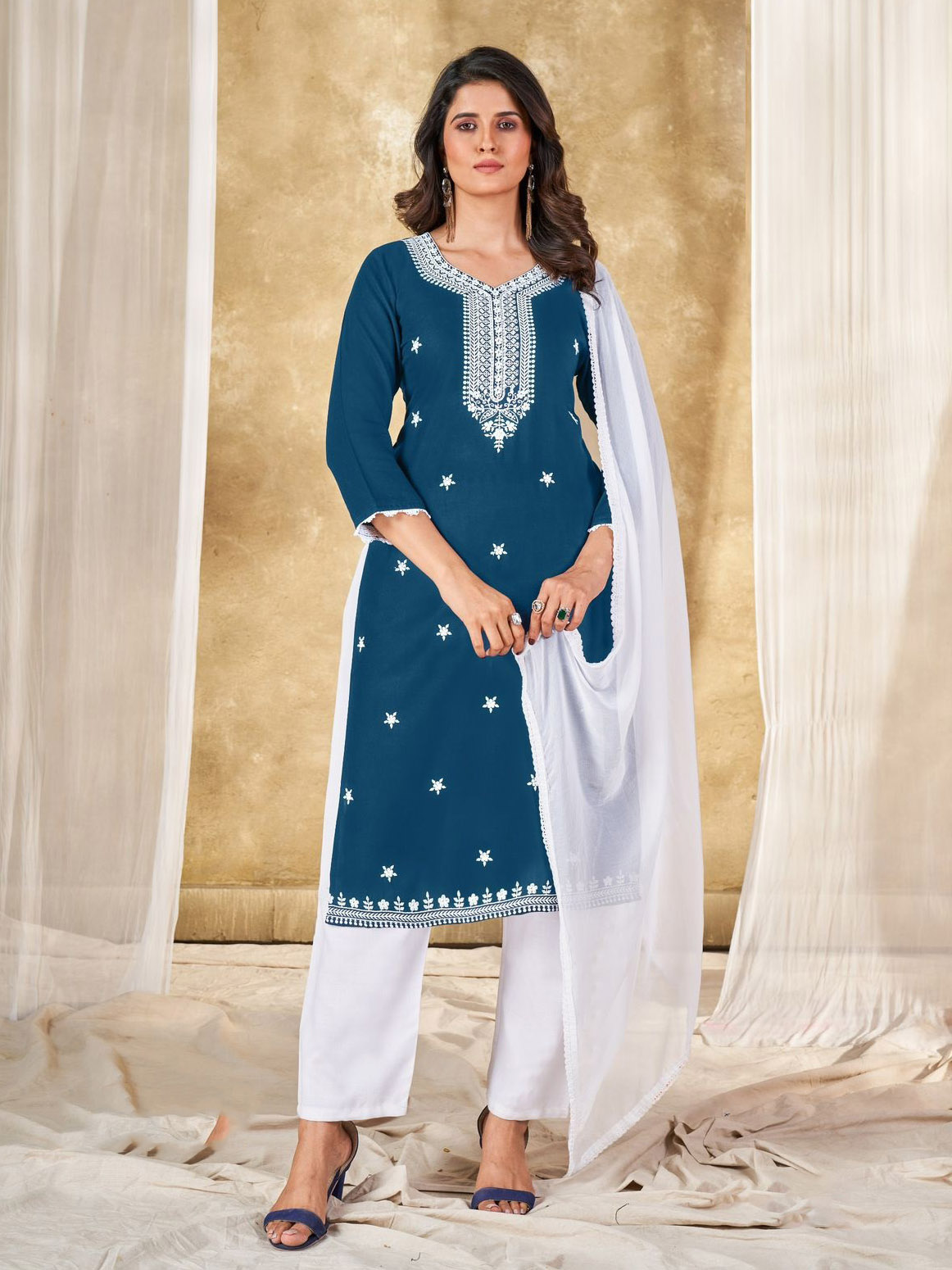 This pant-kurti set features a beautiful design in rayon fabric. The kurti has a rich blue color with elegant embroidery at the neckline, hem, and scattered floral motifs. The sleeves are three-quarters in length. The designer pant bottom is of premium rayon and white in color, complementing the blue kurti. The set includes a white nazmin dupatta that adds an elegant touch. It is available in size M (AU 10) with a bust measurement of 38 inches and a waist measurement of 36-37 inches.
