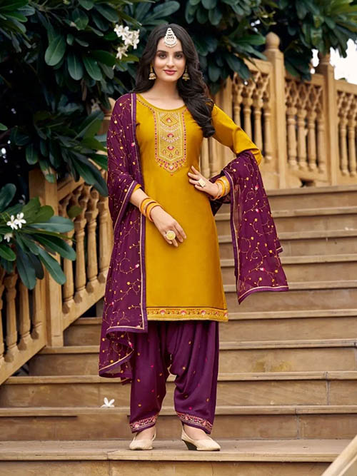 This beautiful salwar kameez patiyala suit top comes in jam silk cotton and is enhanced with elegant work. The designer patiyala bottom (salwar) comes in premium viscose rayon. Dupatta comes in nazmin.