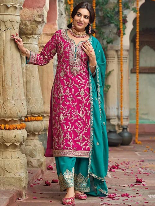 This beautiful salwar kameez pant suit top comes in chinon and is enhanced with elegant work. The designer pant bottom (salwar) comes in premium chinon. Dupatta comes in chinon.