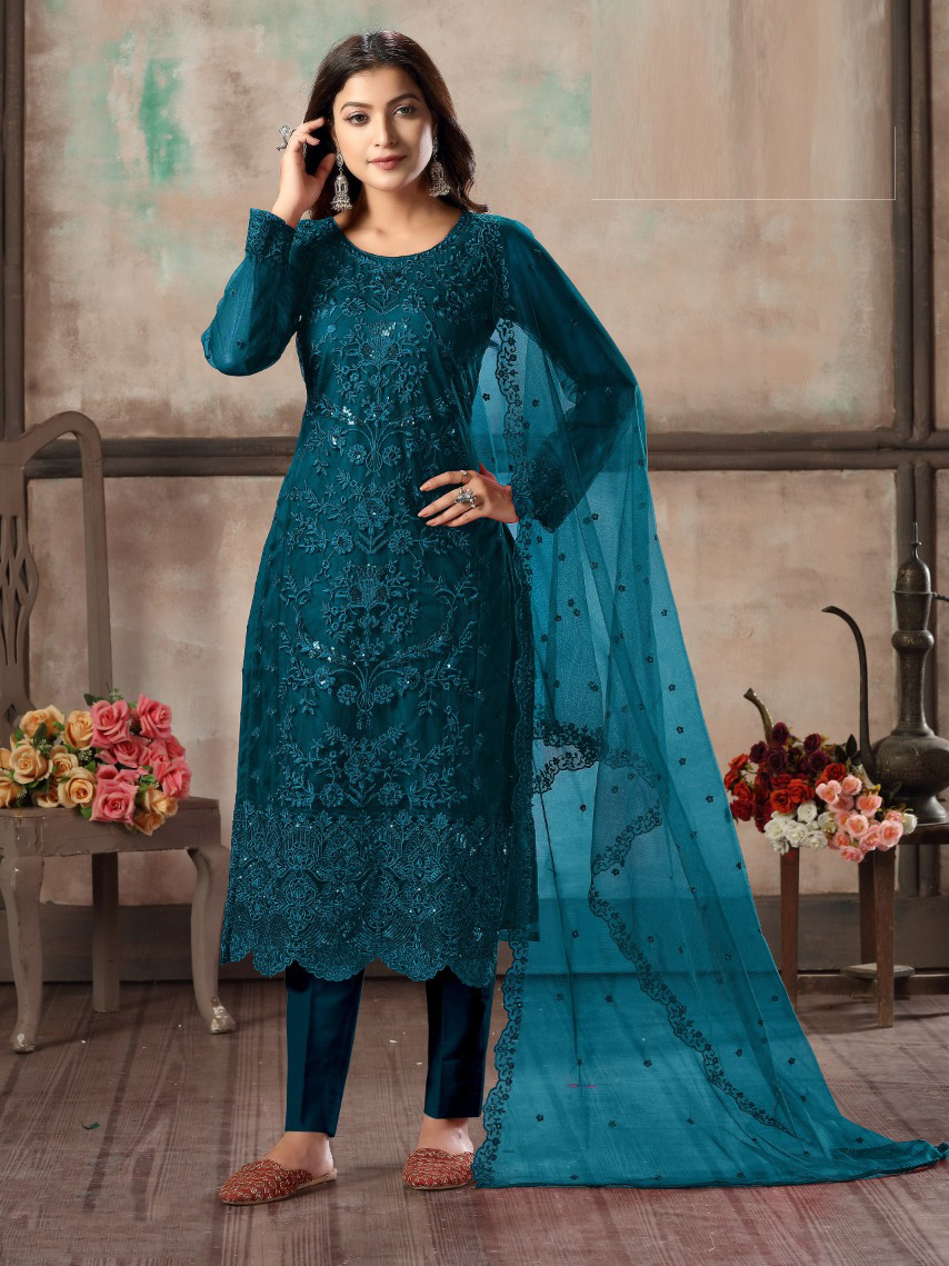 This beautiful salwar kameez pant suit top comes in net and is enhanced with elegant work. The designer pant bottom (salwar) comes in premium santoon. Dupatta comes in net.