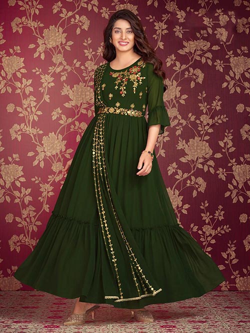 This dress is an Indo-Western gown made of georgette fabric, featuring elegant embroidery and detailing. The dark green gown is accented with floral embroidery on the bodice and golden embellishments. The sleeves are elbow-length with a slight bell shape. The skirt of the gown is flared and layered, providing a flowing silhouette. Size: Medium (M) - AU 10 - Bust: 38 inches - Waist: 36-37 inches It also includes a dupatta, likely in matching or complementary georgette fabric.