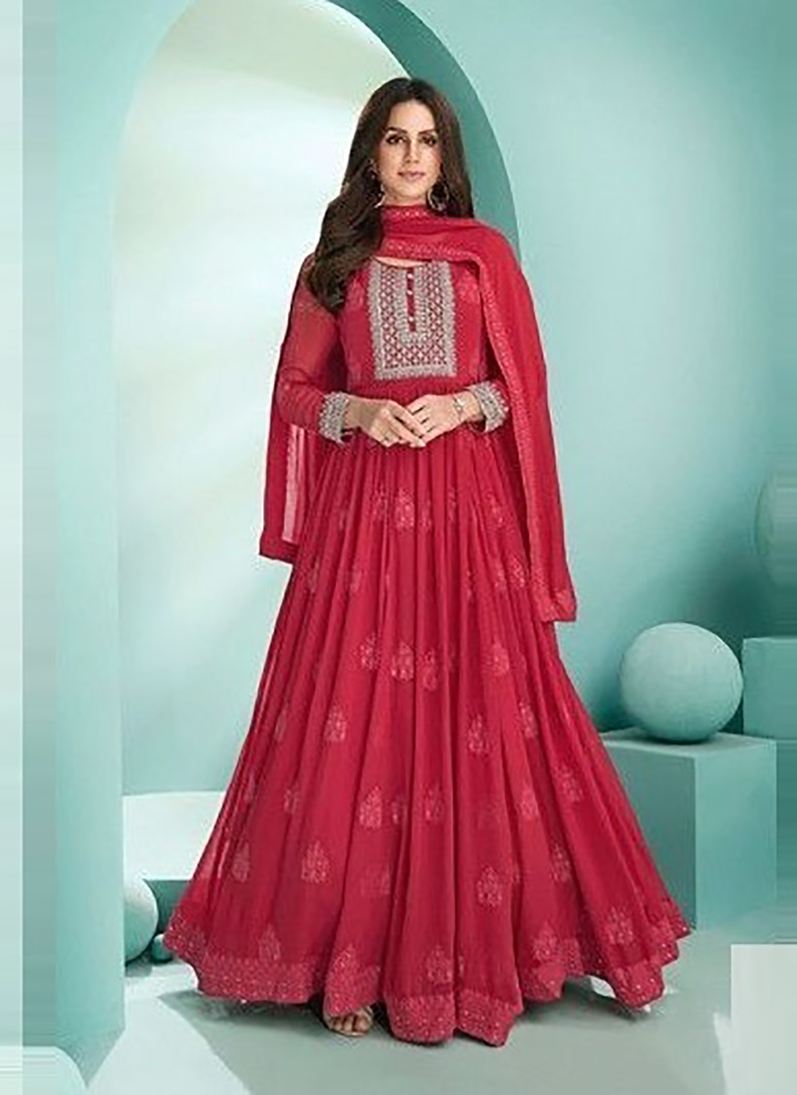 This celebrity indo western gown comes in georgette enhanced with elegant work. Dupatta comes in georgette.