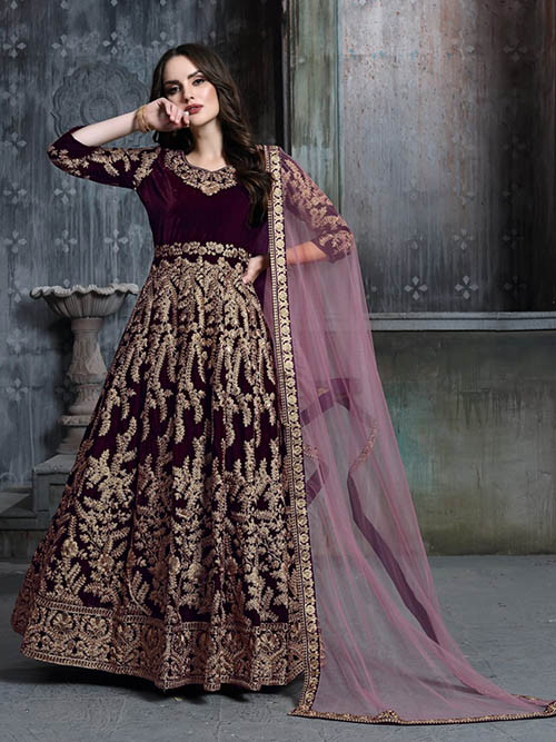 This celebrity indo western gown comes in velvet enhanced with elegant work. Dupatta comes in net.