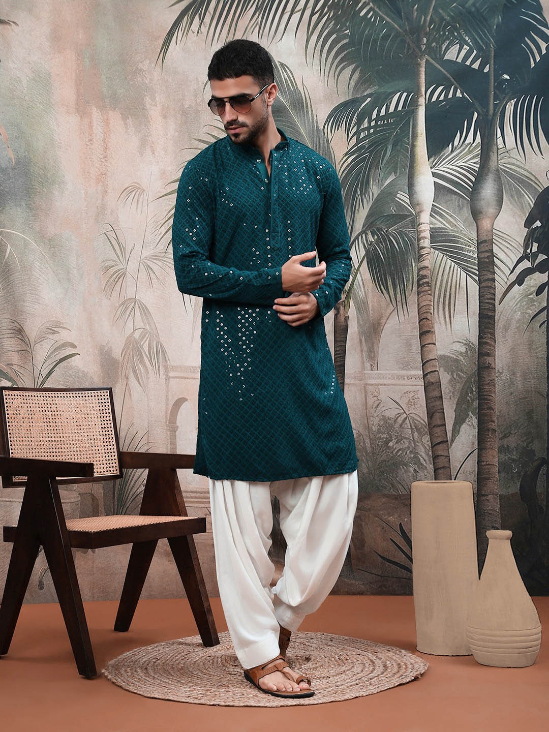 The dress in the picture is a stylish menswear ensemble featuring a kurta and pyjama. Here are the details: - Kurta: - Fabric: Premium rayon with sequin embellishments. - Color: Deep teal with a subtle pattern enhanced by sequins. - Style: Full sleeves with a classic collar. - Pyjama: - Fabric: Premium cotton-silk blend. - Color: Off-white. - Style: Traditional loose fit for comfortable wear. - Size: - Size: Large (L) - Chest: 40 inches This ensemble is ideal for occasions requiring a touch of elegance and comfort.