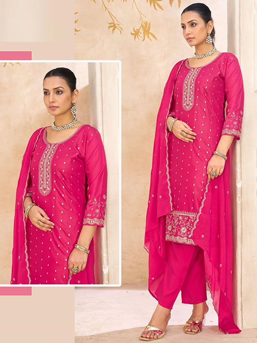 This beautiful pant kurti top comes in chanderi buti and is enhanced with elegant work. The designer pant bottom comes in premium roman silk. Dupatta comes in chinon.