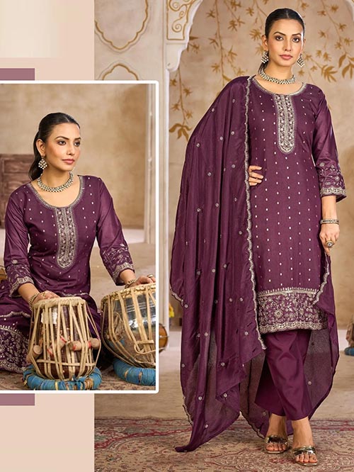 This beautiful pant kurti top comes in chanderi buti and is enhanced with elegant work. The designer pant bottom comes in premium roman silk. Dupatta comes in chinon.