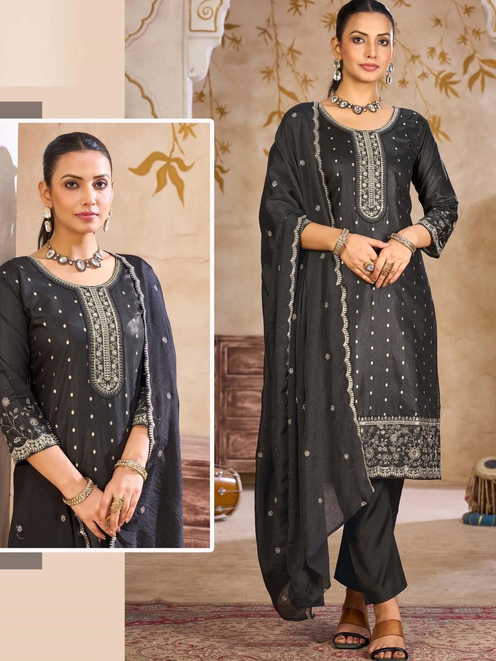 This beautiful pant kurti top comes in chanderi buti and is enhanced with elegant work. The designer pant bottom comes in premium roman silk. Dupatta comes in chinon.