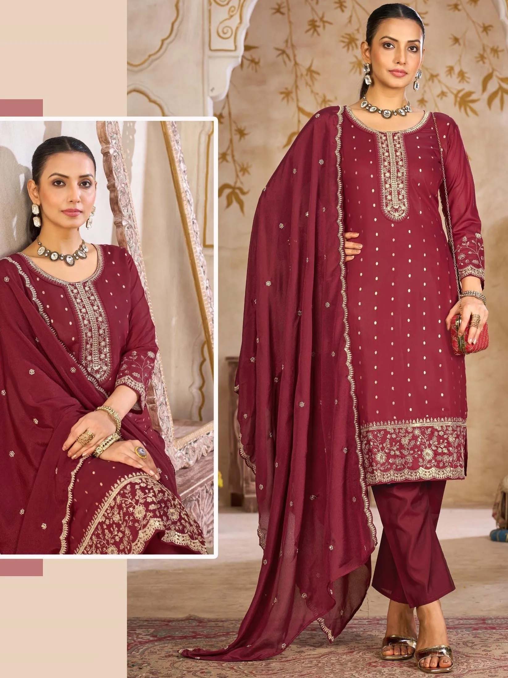 This beautiful pant kurti top comes in chanderi buti and is enhanced with elegant work. The designer pant bottom comes in premium roman silk. Dupatta comes in chinon.
