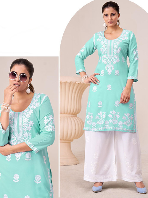 This beautiful palazzo kurti top comes in rayon and is enhanced with elegant work. The designer palazzo bottom comes in premium rayon.