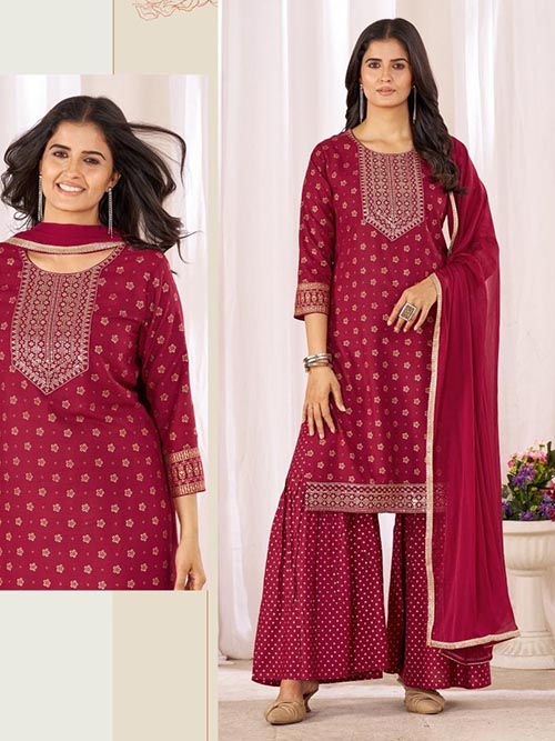 This beautiful garara kurti top comes in rayon and is enhanced with elegant work. The designer garara bottom comes in premium rayon. Dupatta comes in nazmin.