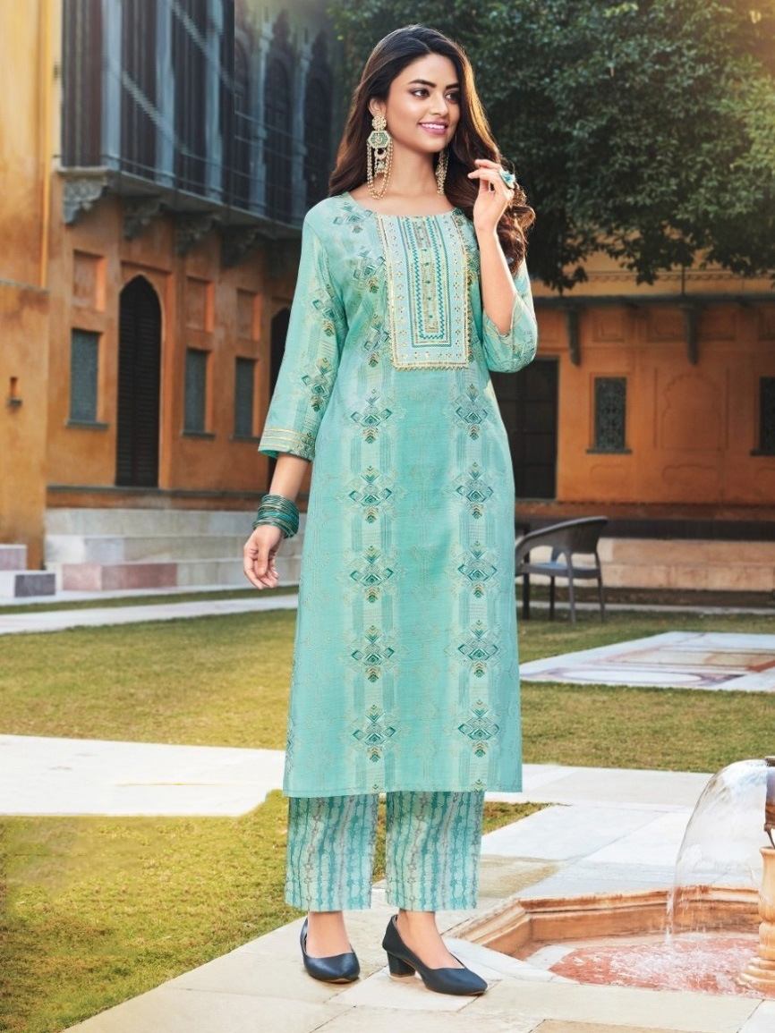 This beautiful pant kurti top comes in chanderi foil print and is enhanced with elegant work. Pant bottom comes in premium chanderi foil print.