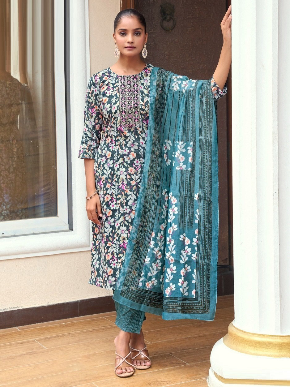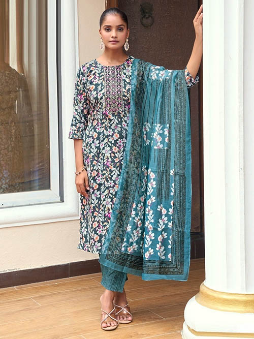This beautiful pant kurti top comes in cotton and is enhanced with elegant work. The designer pant bottom comes in premium cotton. Dupatta comes in cotton.
