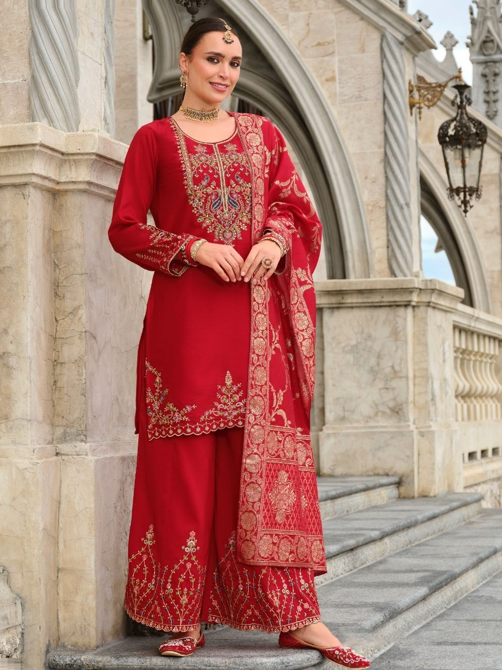 This beautiful salwar kameez palazzo suit top comes in silk and is enhanced with elegant work. The designer palazzo bottom (salwar) comes in premium silk. Dupatta comes in viscose jacquard.