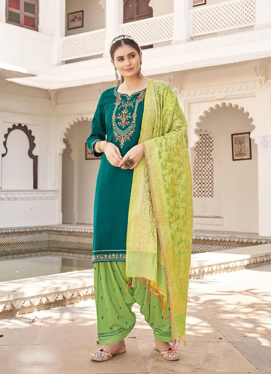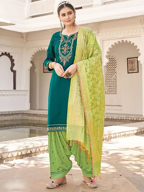 This beautiful salwar kameez patiala suit top comes in jam silk and is enhanced with elegant work. Patiala bottom salwar comes in premium rayon. Dupatta comes in banarasi silk jacquard.