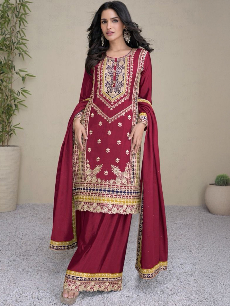 This beautiful salwar kameez palazzo suit top comes in chinon and is enhanced with elegant work. The designer palazzo bottom (salwar) comes in premium chinon. Dupatta comes in chinon.