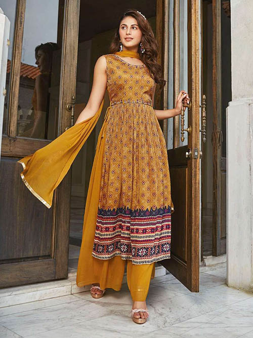 This beautiful salwar kameez palazzo suit top comes in crochet chinon and is enhanced with elegant work. Palazzo bottom salwar comes in premium georgette. Dupatta comes in nazmin.