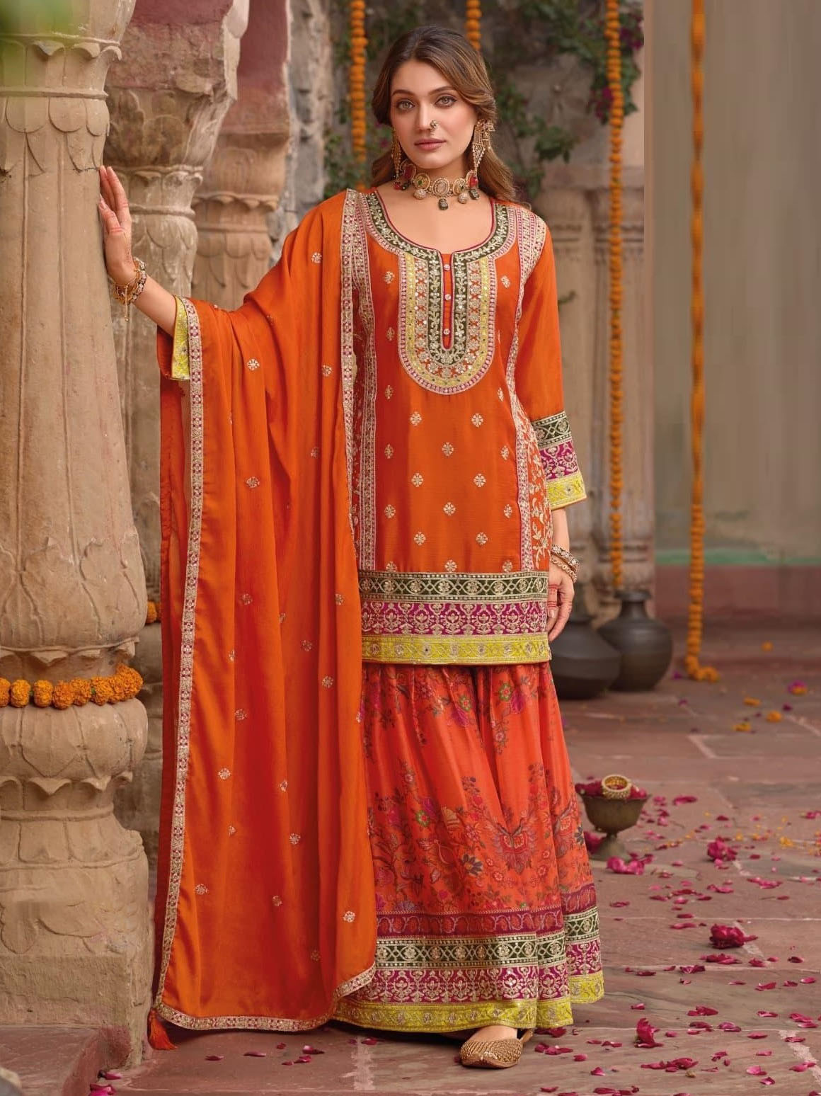 This beautiful salwar kameez sharara suit top comes in chinon and is enhanced with elegant work. The designer sharara bottom (salwar) comes in premium chinon. Dupatta comes in chinon.
