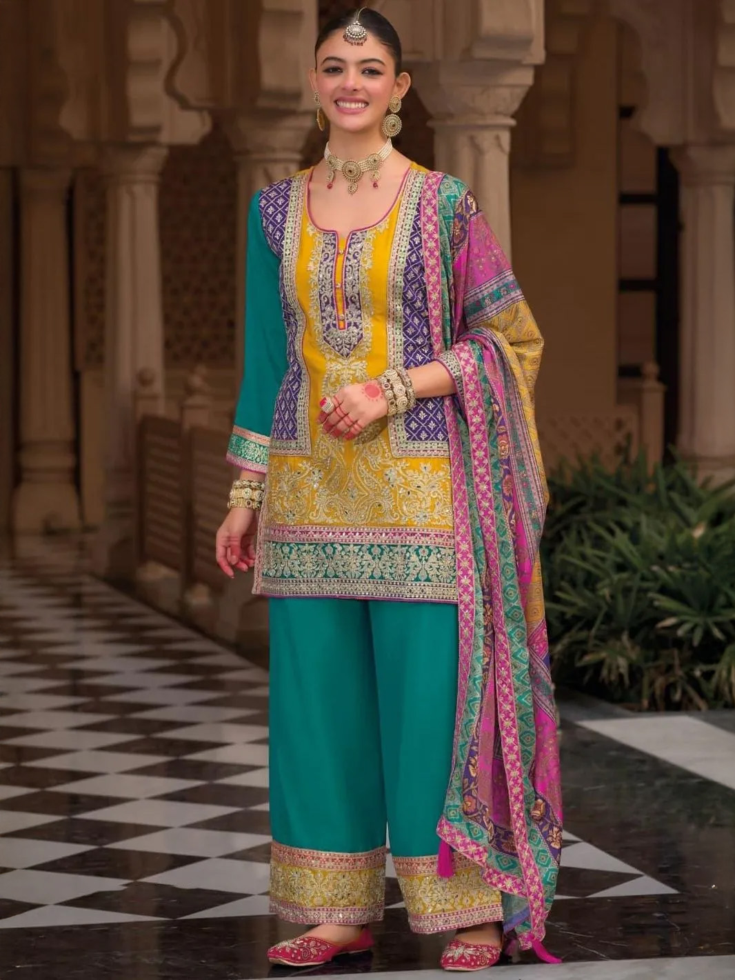 This beautiful salwar kameez sharara suit top comes in chinon and is enhanced with elegant work. The designer sharara bottom (salwar) comes in premium chinon. Dupatta comes in chinon.