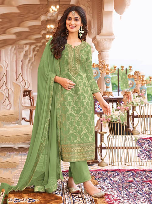 This beautiful salwar kameez pant suit top comes in viscose jacquard and is enhanced with elegant work. Pant bottom salwar comes in premium cotton. Dupatta comes in nazmin chiffon.