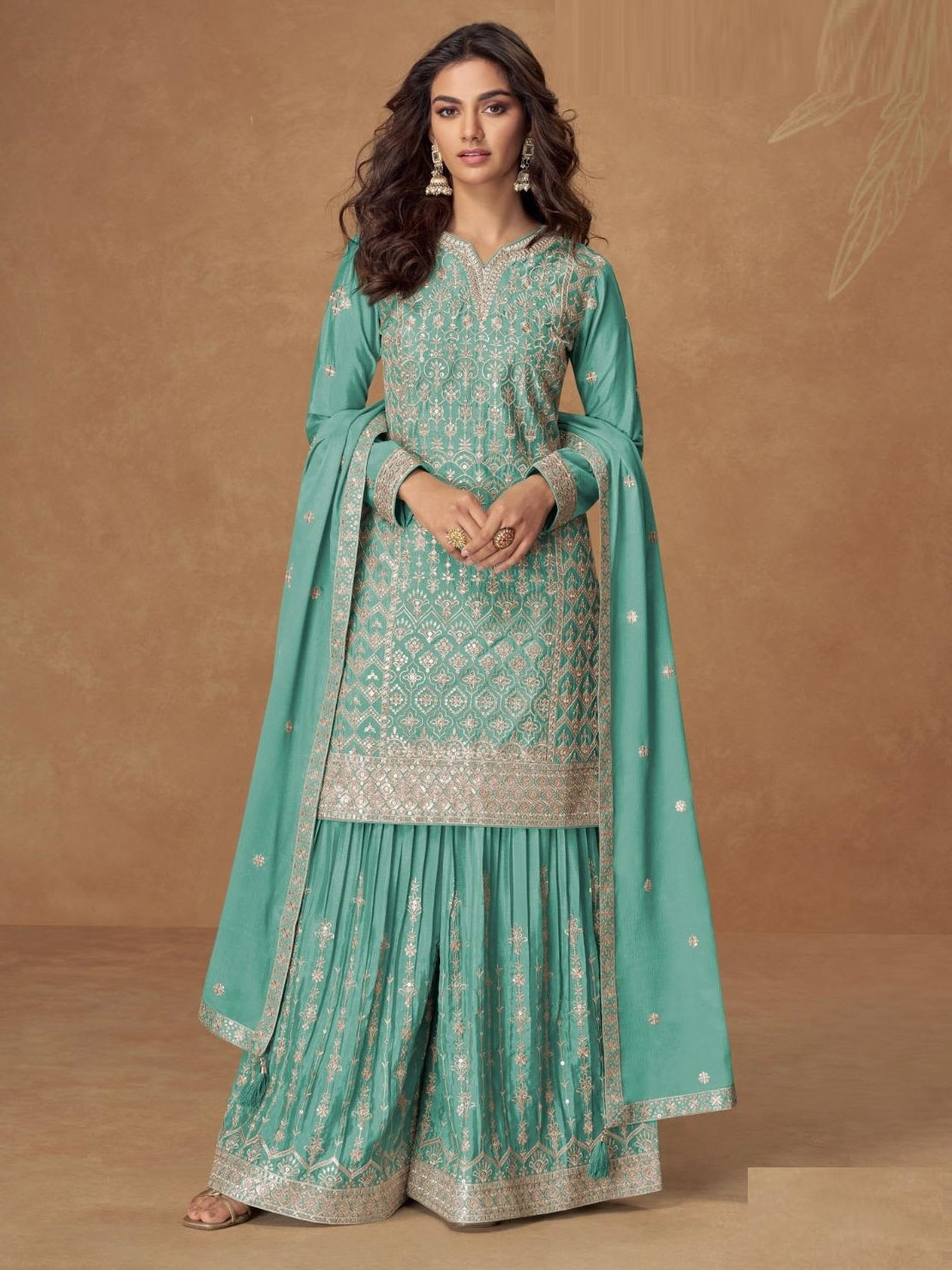 This beautiful salwar kameez sharara suit top comes in chinon silk and is enhanced with elegant work. The designer sharara bottom (salwar) comes in premium chinon silk. Dupatta comes in chinon silk.