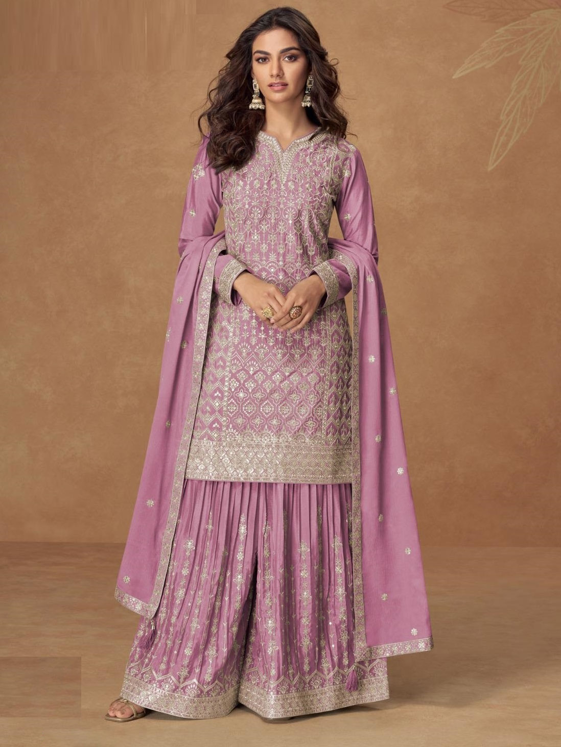 This beautiful salwar kameez sharara suit top comes in chinon silk and is enhanced with elegant work. The designer sharara bottom (salwar) comes in premium chinon silk. Dupatta comes in chinon silk.