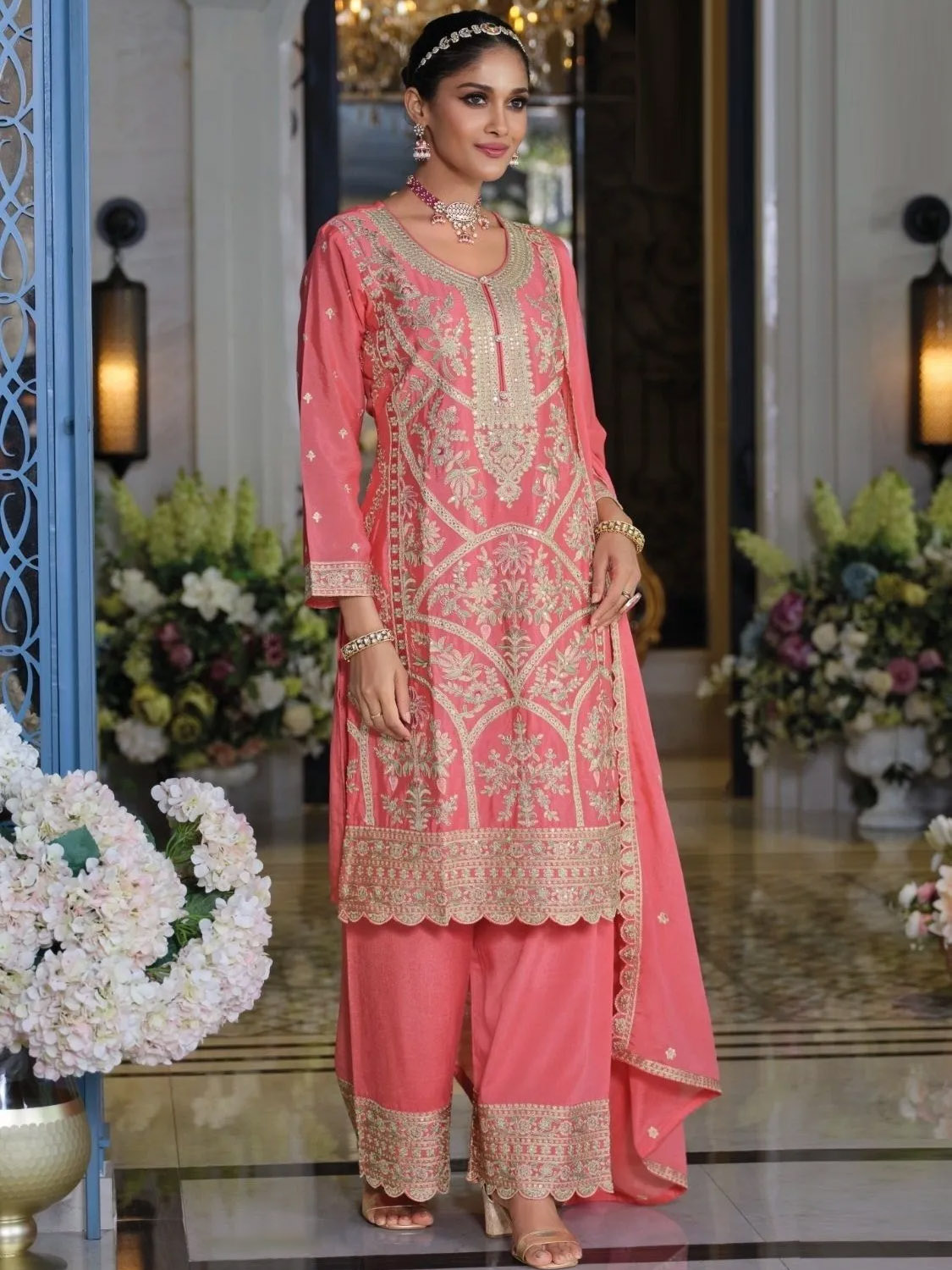 This beautiful salwar kameez palazzo suit top comes in chinon and is enhanced with elegant work. The designer palazzo bottom (salwar) comes in premium chinon. Dupatta comes in chinon.