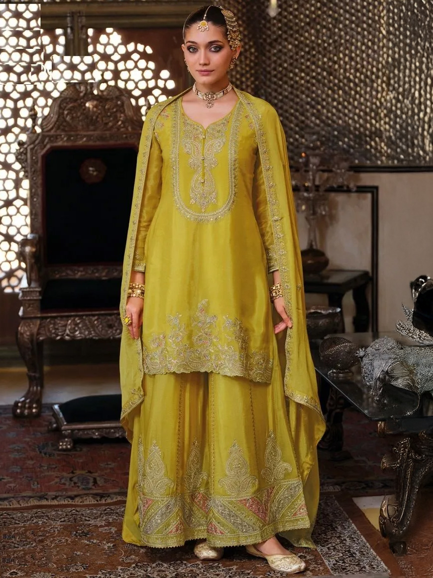 This beautiful salwar kameez sharara suit top comes in chinon and is enhanced with elegant work. The designer sharara bottom (salwar) comes in premium chinon. Dupatta comes in chinon.