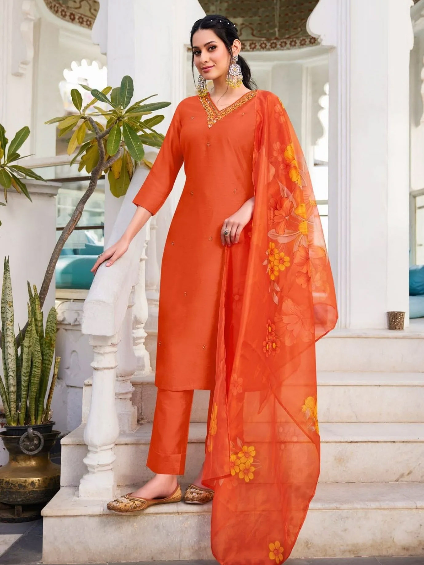 This beautiful salwar kameez pant suit top comes in modal silk and is enhanced with elegant work. The designer pant bottom (salwar) comes in premium modal silk. Dupatta comes in organza.
