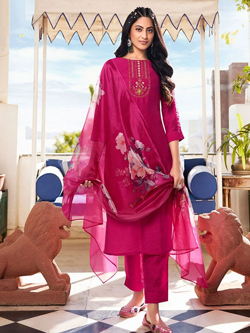 This beautiful salwar kameez pant suit top comes in modal silk and is enhanced with elegant work. The designer pant bottom (salwar) comes in premium modal silk. Dupatta comes in organza.