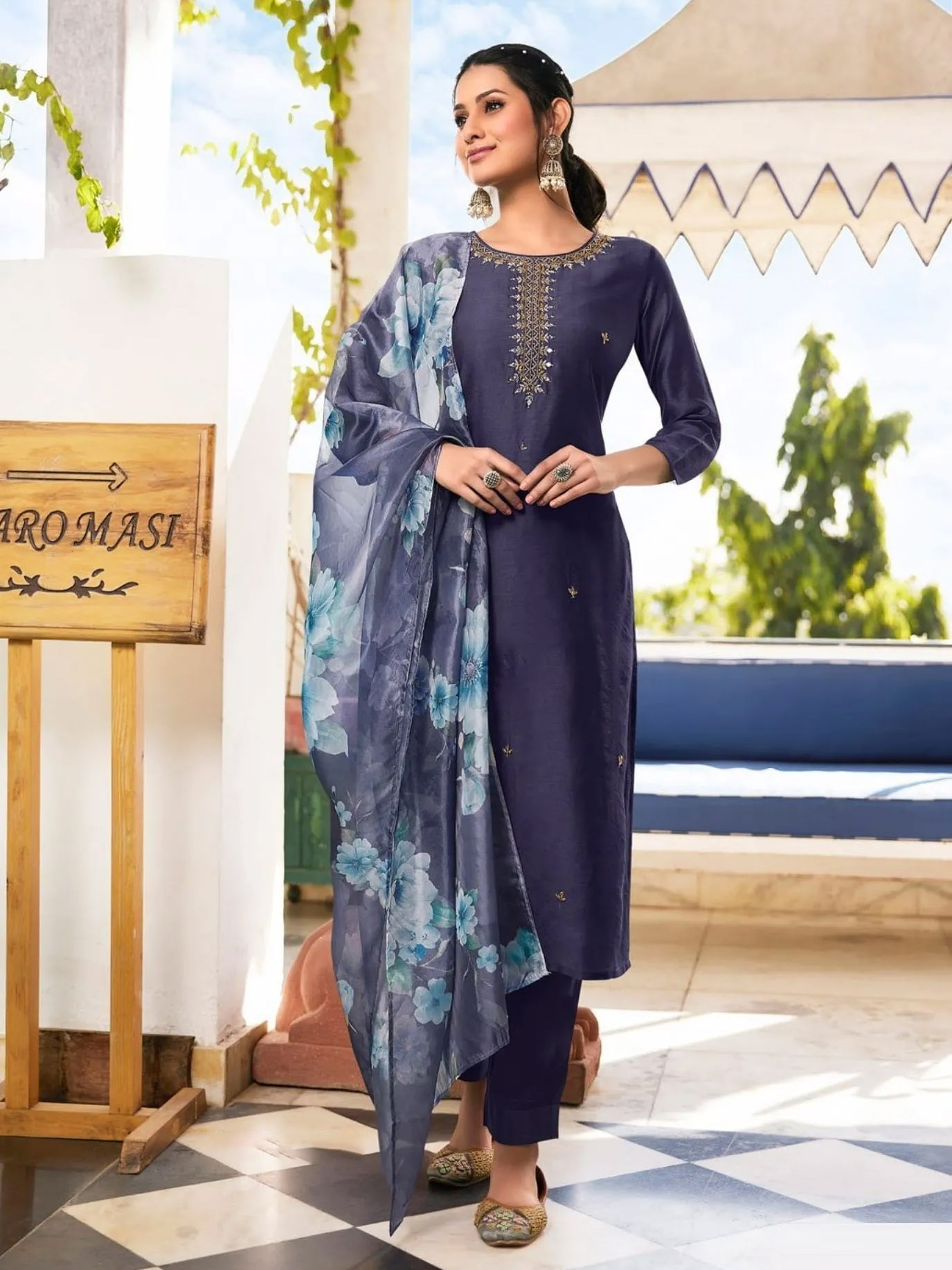 This beautiful salwar kameez pant suit top comes in modal silk and is enhanced with elegant work. The designer pant bottom (salwar) comes in premium modal silk. Dupatta comes in organza.