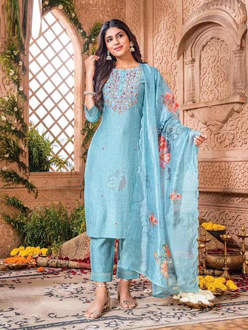 This beautiful salwar kameez pant suit top comes in viscose and is enhanced with elegant work. Pant bottom salwar comes in premium viscose. Dupatta comes in organza.