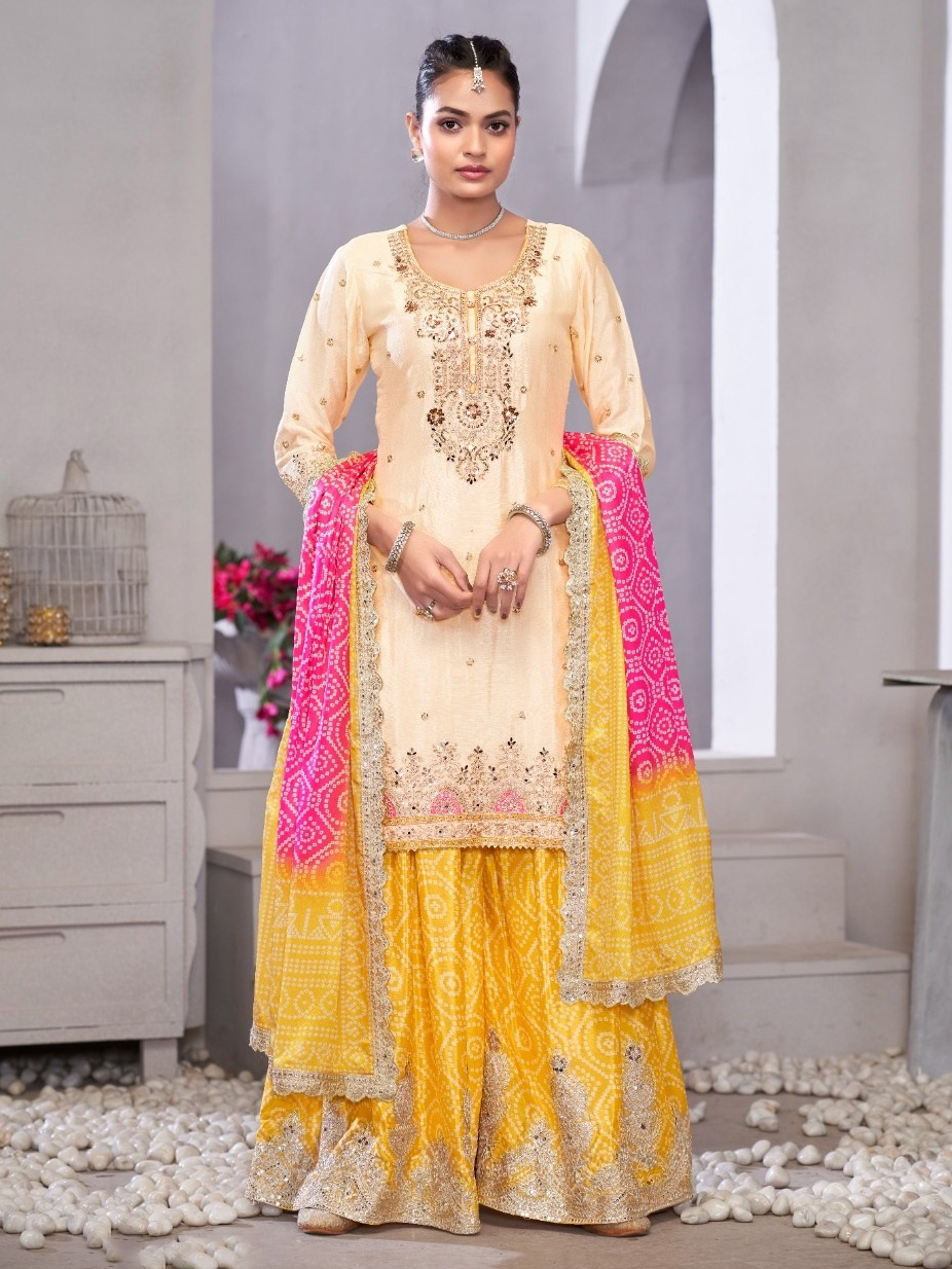 This beautiful salwar kameez palazzo suit top comes in chinon and is enhanced with elegant work. The designer palazzo bottom (salwar) comes in premium chinon. Dupatta comes in chinon.