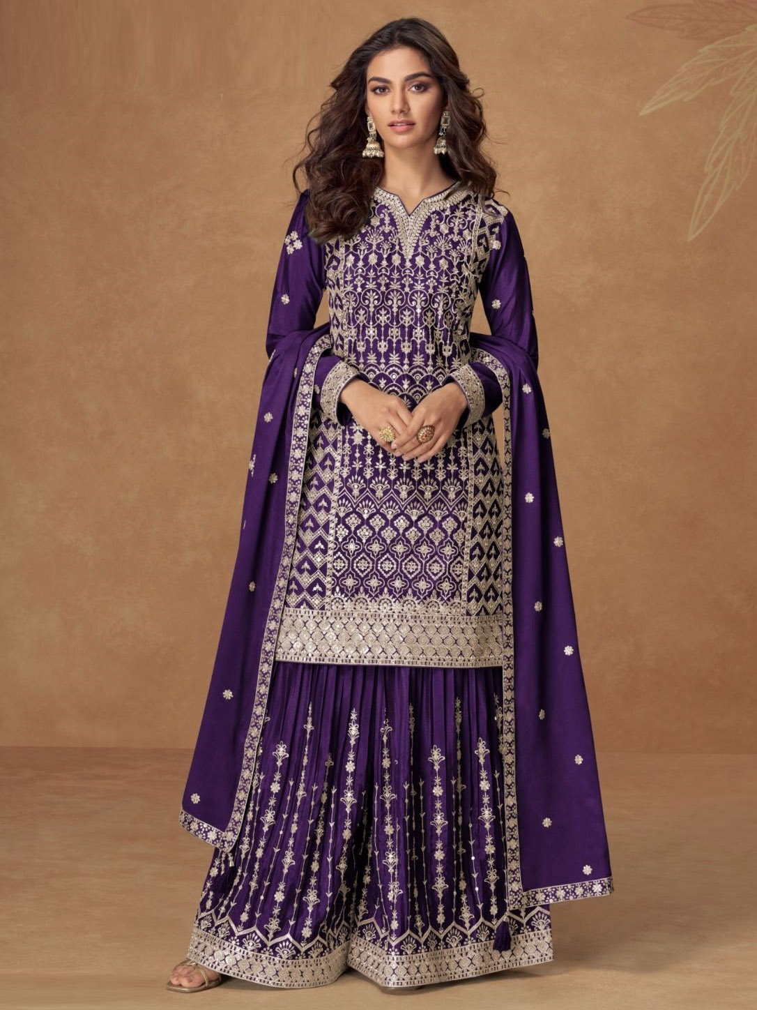 This beautiful salwar kameez sharara suit top comes in chinon silk and is enhanced with elegant work. The designer sharara bottom (salwar) comes in premium chinon silk. Dupatta comes in chinon silk.