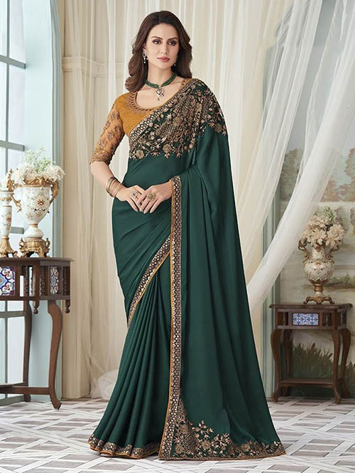 This image shows a beautiful Indian saree made from premium silk in a rich dark green color. The saree features elaborate embroidery work with gold and intricate designs along the border and pallu, enhancing its elegance. The blouse is crafted from premium silk in a contrasting mustard or gold shade. It has intricate embroidery on the sleeves and neckline, complementing the overall design of the saree. This ensemble would typically be available in standard saree lengths, around 5.5 to 6 meters, with additional fabric for the blouse that can be tailored to fit various sizes.
