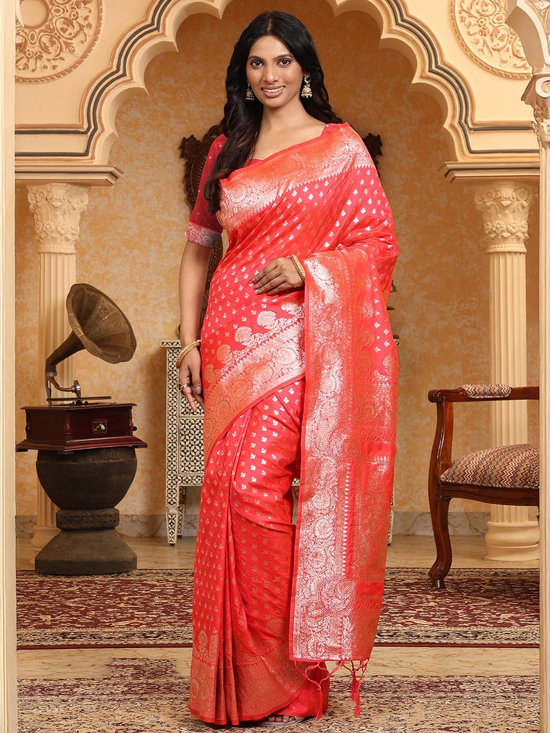 This beautiful premium banarasi silk Indian saree / sari comes with elegant work. The saree blouse comes in premium banarasi silk.