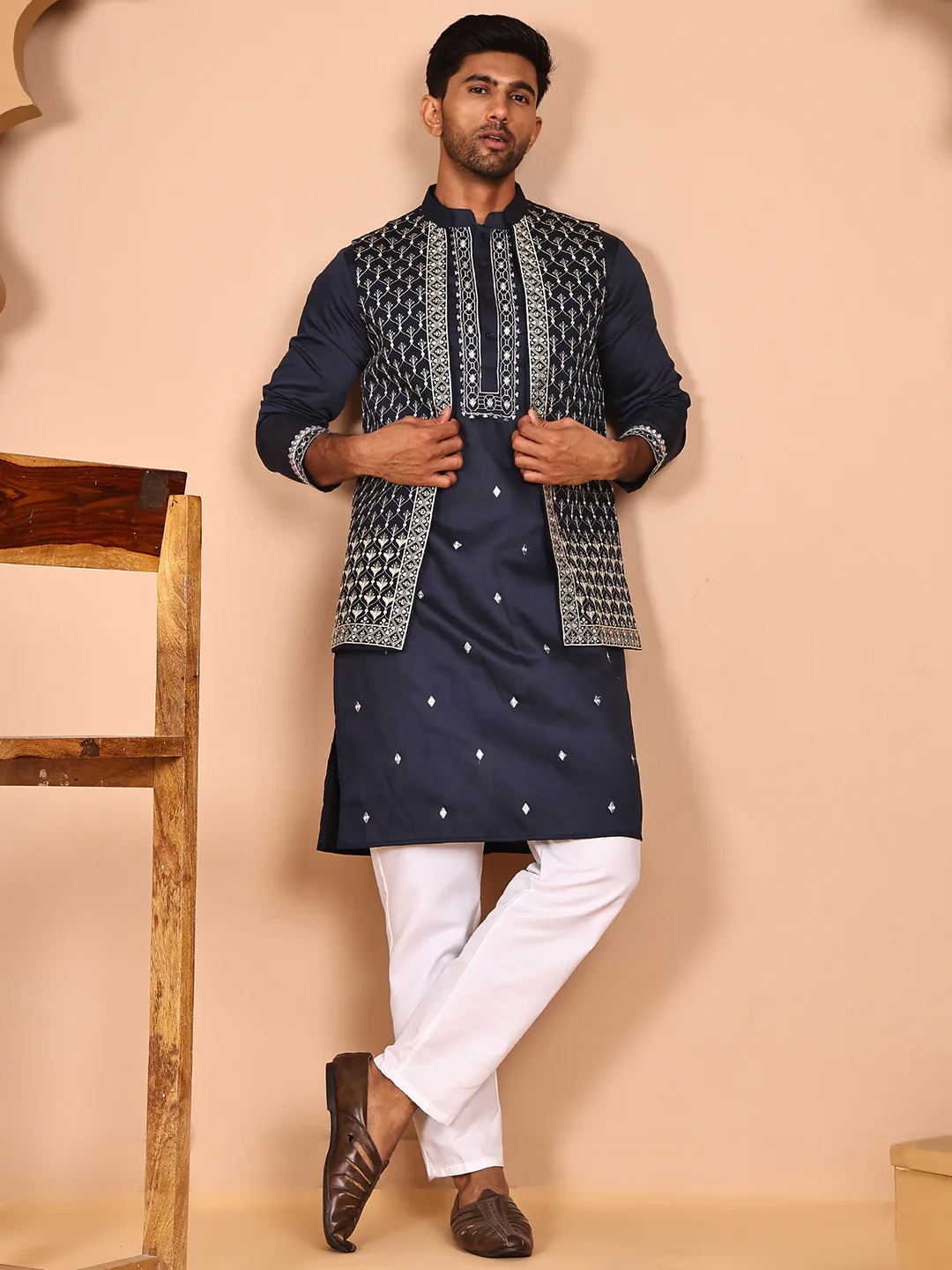 This ready to wear designer kurta comes in a premium cotton-silk blend. Top kurta fabric is cotton-silk blend and Nehru jacket comes in a premium cotton-silk blend. The bottom pant comes in a premium cotton-silk blend.