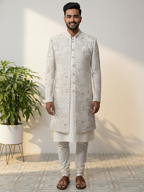 For men, explore our premium selection of Designer Kurtas, Kurta Pajama sets, Sherwanis, Indo-Western suits, and Pathani suits. Our Kurta Pajama Jacket sets, featuring classic Nehru Jackets and Modi Jackets, are ideal for weddings, receptions, and festive events. Our embroidered, silk, and cotton ethnic wear for men brings together traditional elegance and contemporary style.
