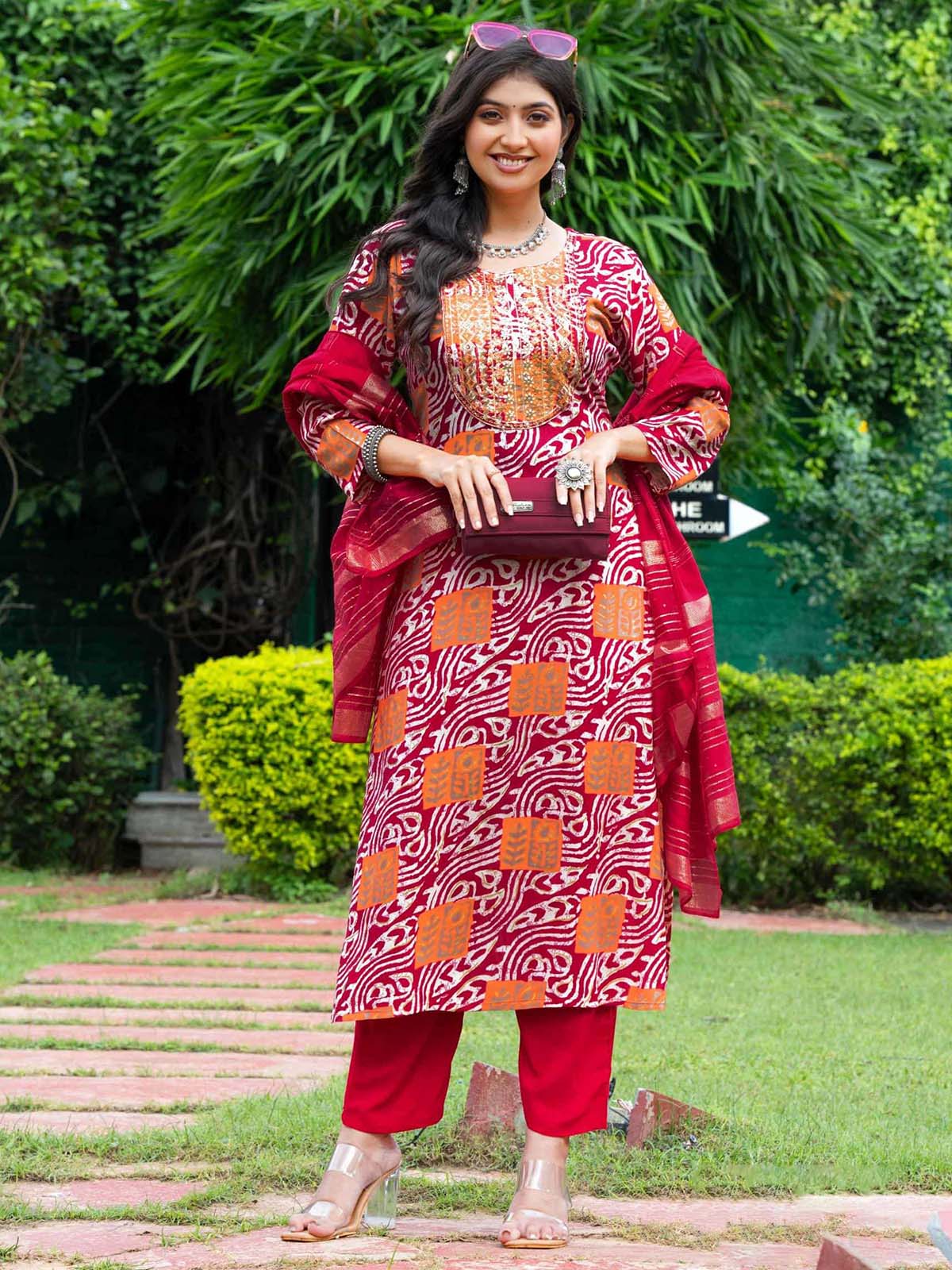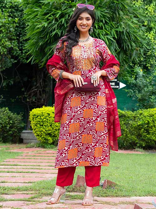 This beautiful pant suit top comes in rayon and is enhanced with elegant work. The designer pant bottom comes in premium rayon. Dupatta comes in jacquard.