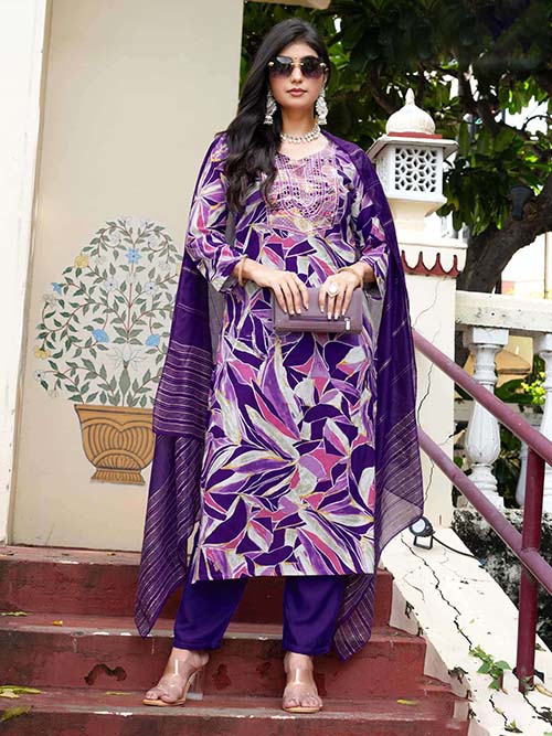 This beautiful pant suit top comes in rayon and is enhanced with elegant work. The designer pant bottom comes in premium rayon. Dupatta comes in jacquard.