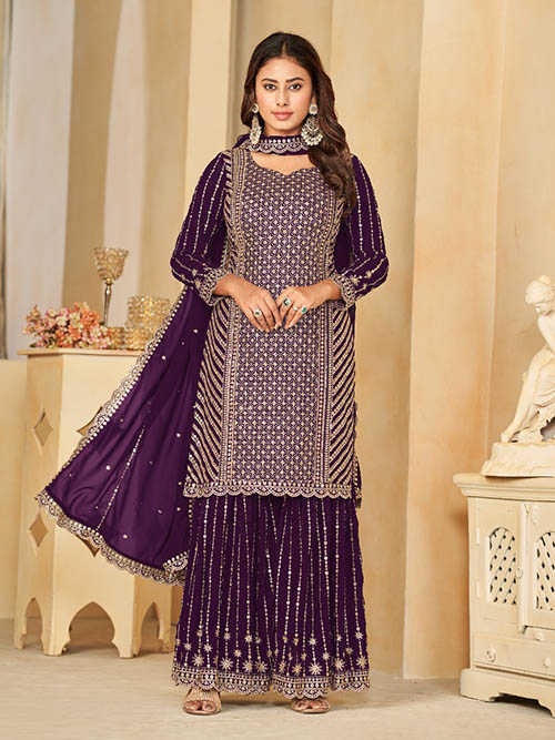 This beautiful salwar kameez garara suit top comes in georgette and is enhanced with elegant work. The designer garara bottom (salwar) comes in premium georgette. Dupatta comes in georgette.