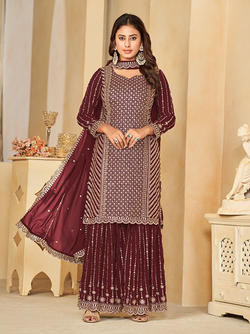This beautiful salwar kameez garara suit top comes in georgette and is enhanced with elegant work. The designer garara bottom (salwar) comes in premium georgette. Dupatta comes in georgette.