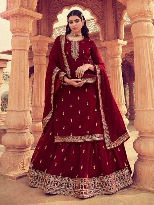 This beautiful salwar kameez ghagra suit top comes in georgette and is enhanced with elegant work. Ghagra bottom salwar comes in premium georgette. Dupatta comes in chinon.