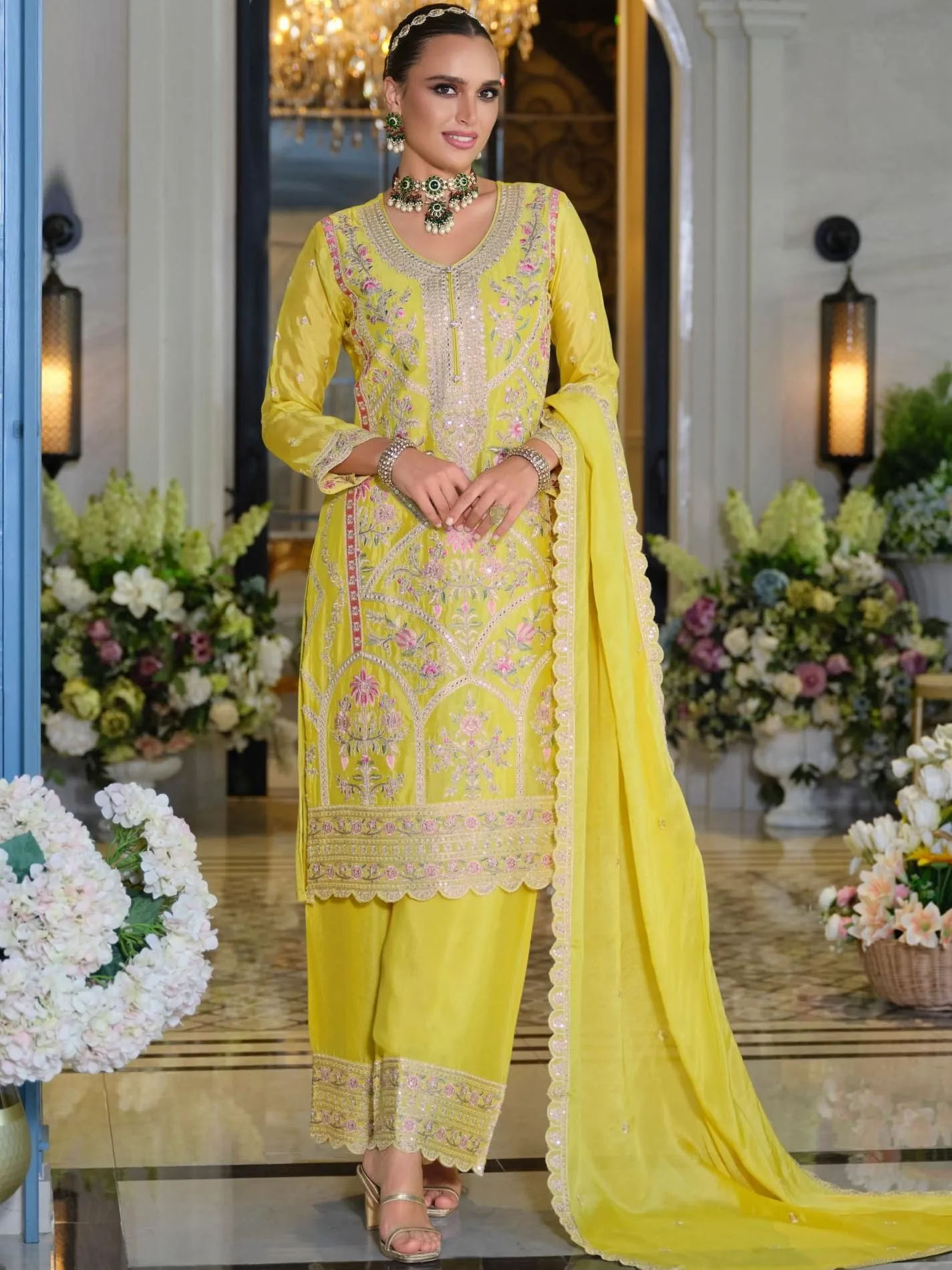 This beautiful salwar kameez palazzo suit top comes in chinon and is enhanced with elegant work. The designer palazzo bottom (salwar) comes in premium chinon. Dupatta comes in chinon.