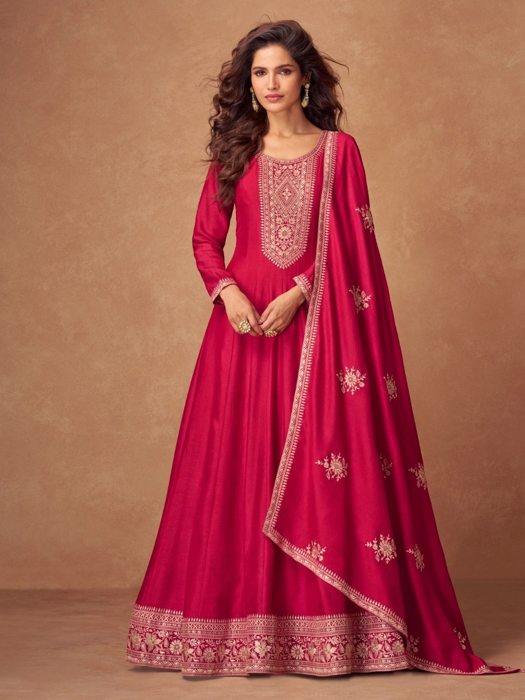 This celebrity indo western gown comes in silk enhanced with elegant work. Dupatta comes in silk.